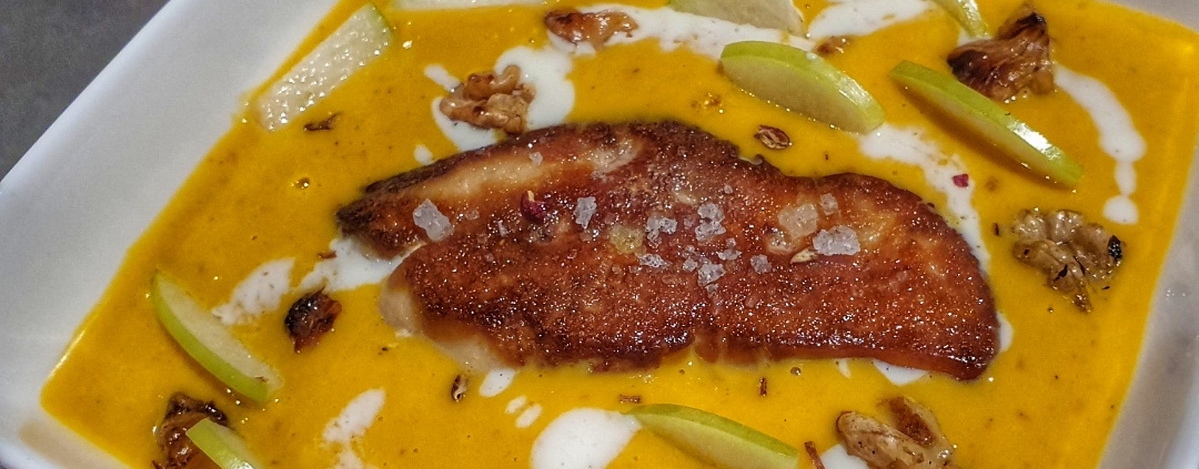 Velouté crémeux de potimarron fumé, zestes de clémentine et foie gras poêlé.