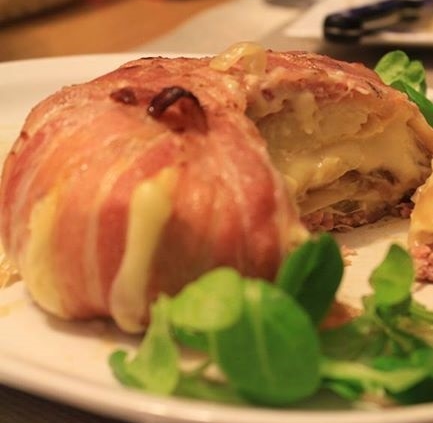 Faire partir les lanières de lard en étoile (le plus serré possible de façon à ce que le fromage ne coule pas lors de la cuisson) pour qu’elles viennent envelopper le tout par-dessous.