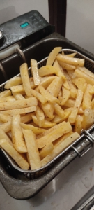 Faire chauffer la friteuse a ~140/150C° pendant 10 à 15 minutes le temps qu'une croûte se forme à la surface, mais sans les laisser brunir.