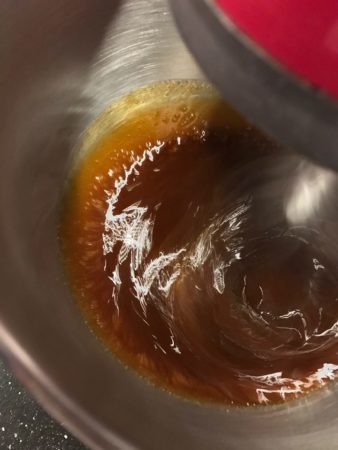 Une fois la température atteinte, verser le sirop chauffé dans le bol d’un robot pâtissier et le fouetter pour le refroidir.