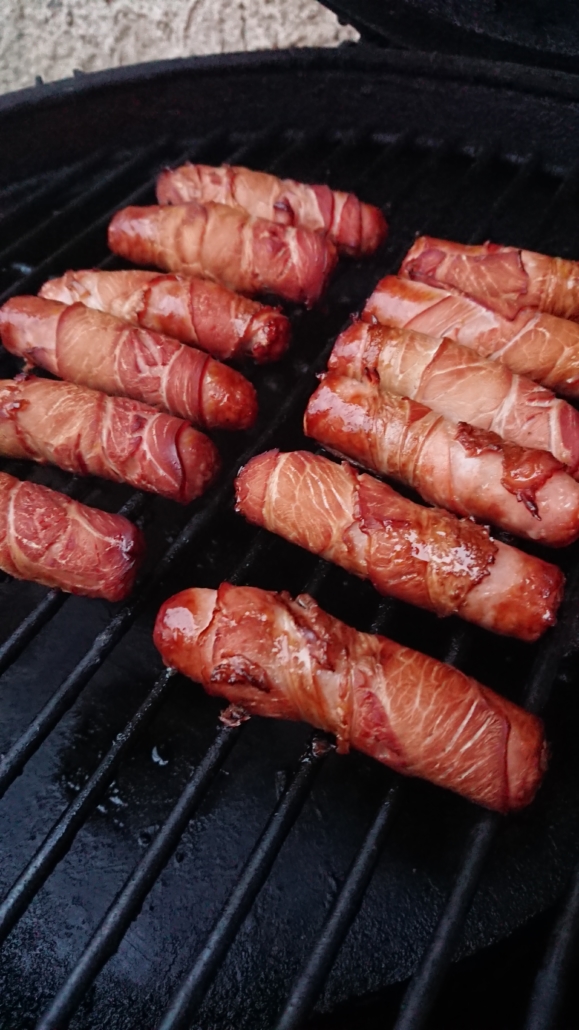 Coupe les saucisses en deux et barde chacun d’une tranche de poitrine.